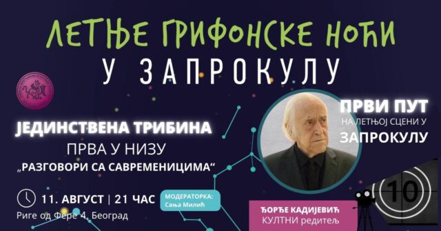 У склопу програма „Летњих грифонских ноћи“ разговор са чувеним редитељем о његовом целокупном уметничком опусу који је променио стандарде у југословенској и српској кинематографији водиће Сања Милић, уредница Културно-уметничког програма РТС-а, уз одабрaне кадрове из Кадијевићевих култних филмова Лептирица, Свето место, Карађорђева стрт, као и ТВ серије Вук Караџић, вероватно најбоље српске историјске серије снимљене у време постојања СФР Југославије која је на предлог Умберта Ека добила награду Гран при Европе на фестивалу у Риму 1987. године. Чућемо и ексклузивно на ком пројекту тренутно ради Ђорђе Кадијевић.