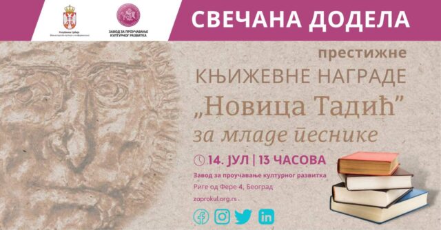 Свечана додела престижне књижевне награде „Новица Тадић“ за младе песнике биће одржана у Галерији Завода за проучавање културног развитка, у четвртак 14. јула 2022. године у 13 часова у улици Риге од Фере 4 у Београду.
