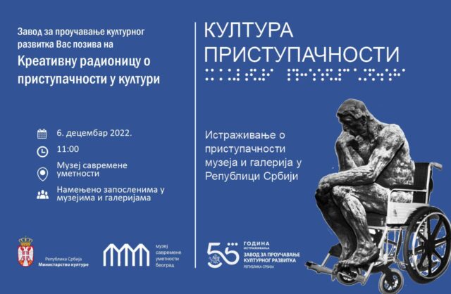Поводом 3. децембра Међународног дана особа са инвалидитетом, Завод за проучавање културног развитка (Запрокул), уз подршку Музеја савремене уметности у Београду, представља истраживање од националног значаја Култура приступачности: истраживање о приступачности музеја и галерија у Републици Србији које ће се одржати 6. децембра, у 11 сати, у Музеју савремене уметности у Београду – Сала Миодраг Б. Протић (Ушће 10).