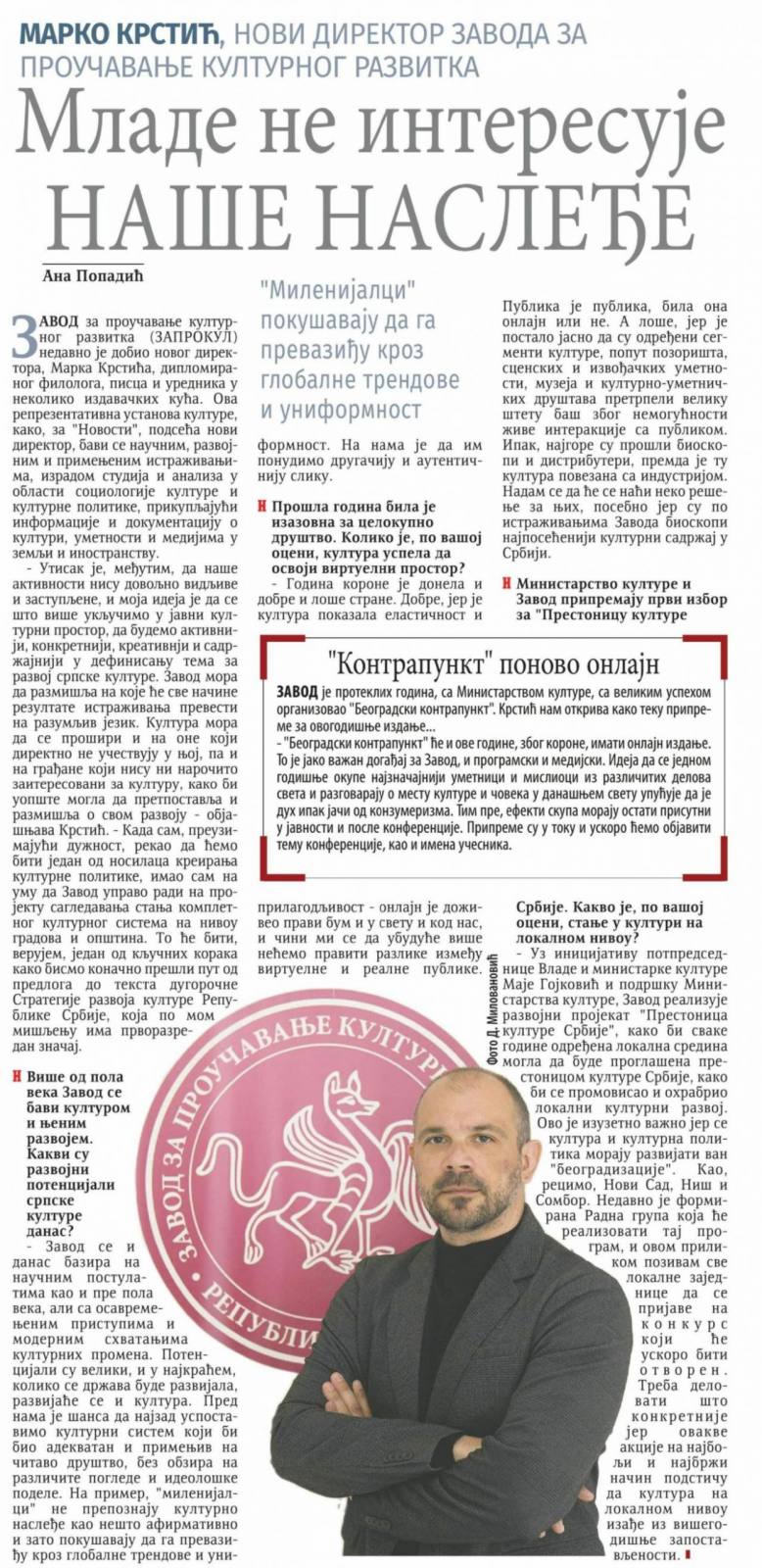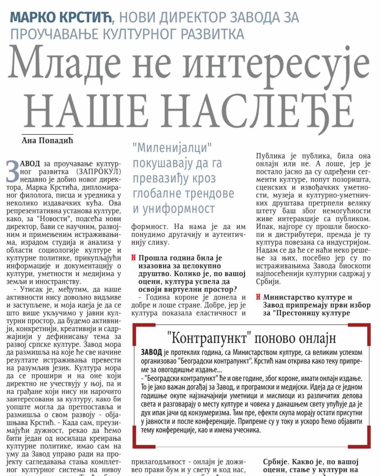 У „Новостима“ је објављен интервју директора Завода за проучавање културног развитка Марка Крстића. Крстић је представио нове активности и изнео планове за даљи рад Завода, истакавши да је његова идеја да Завод управо ради на пројекту сагледавања стања комплетног културног система на нивоу градова и општина, истакавши да ће уз иницијативу потпредседнице Владе и министарке културе Маје Гојковић и подршку Министарства културе, Завод реализовати и развојни пројекат „Престоница културе Србије“, како би сваке године одређена локална средина могла да буде проглашена престоницом културе Србије, како би се промовисао и охрабрио локални културни развој.