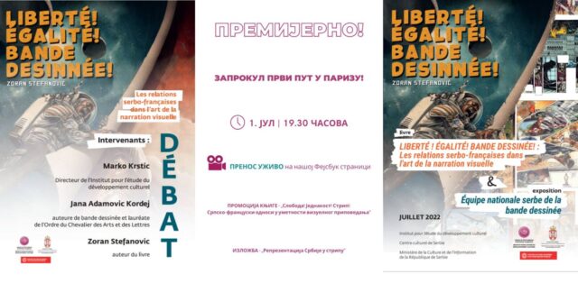 Дуго најављивано представљање српског стрипа у Паризу у организацији Завода за проучавање културног развитка биће одржано у петак, 1 јула у 19:30  у Културном центру Србије. Промоција капиталне књиге Слобода! Једнакост! Стрип! : Српско-француски односи у уметности визуелног приповедања Зорана Стефановића на француском језику у издању Завода за проучавање културног развитка, посвећена је српско-француским везама на пољу стрипа и великом значају стрипа у културној политици обе земље, која се остварује уз међусобну културну сарадњу која је отпочела 2019. године након потписивања споразума у области стрипа председника Србије и Француске.
