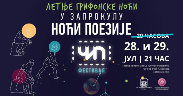 Јединствене вечери поезије под називом ЧИП ФЕСТИВАЛ: НОЋИ ПОЕЗИЈЕ одржаће се у оквиру програма Летњих грифонских ноћи у Заводу за проучавање културног развитка (Запрокул), у четвртак 28. и петак 29. јула са почетком у 21 час, у улици Риге од Фере број 4. За све који ово лето проводе у Београду осмисли смо вечери младе песничке сцене које ће се одиграти на летњој сцени Запрокула.