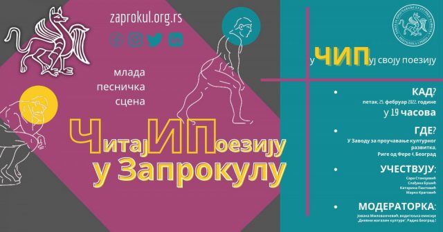 У несвакидашњем поетском сусрету младе песничке сцене под називом „ЧИП“ овог месеца говорићемо о извођењу поезије пред публиком, важности читања у јавности, разликама у интерпретирању поезије кроз време у Галерији Завода за проучавање културног развитка у петак, 25. фебруара у 19 часова. У разговор ћемо укључити и публику која заједно са учесницима сваки сусрет чини лепшим и потпунијим. Дођите да се заједно ЧИП-ујемо поезијом и простор озвучимо стиховима!