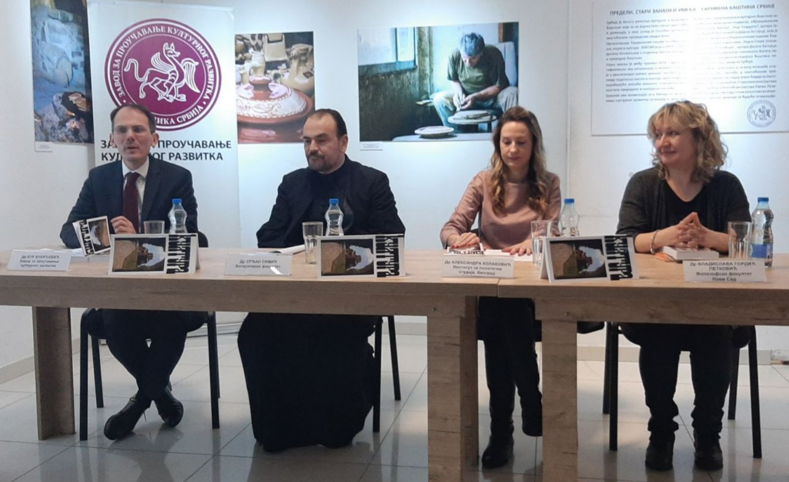 (Фото Завод, на фотографији с лева на десно: др Вук Вукићевић, одговорни уредник часописа „Култура“ и директор Завода за проучавање културног развитка, проф. др Срђан Симић, уредник теме 800 година аутокефалности Српске православне цркве, др Александра Колаковић, коуредница теме Србија и Француска – култура, образовање, политика, проф. др Владислава Гордић Петковић, главна уредница часописа)