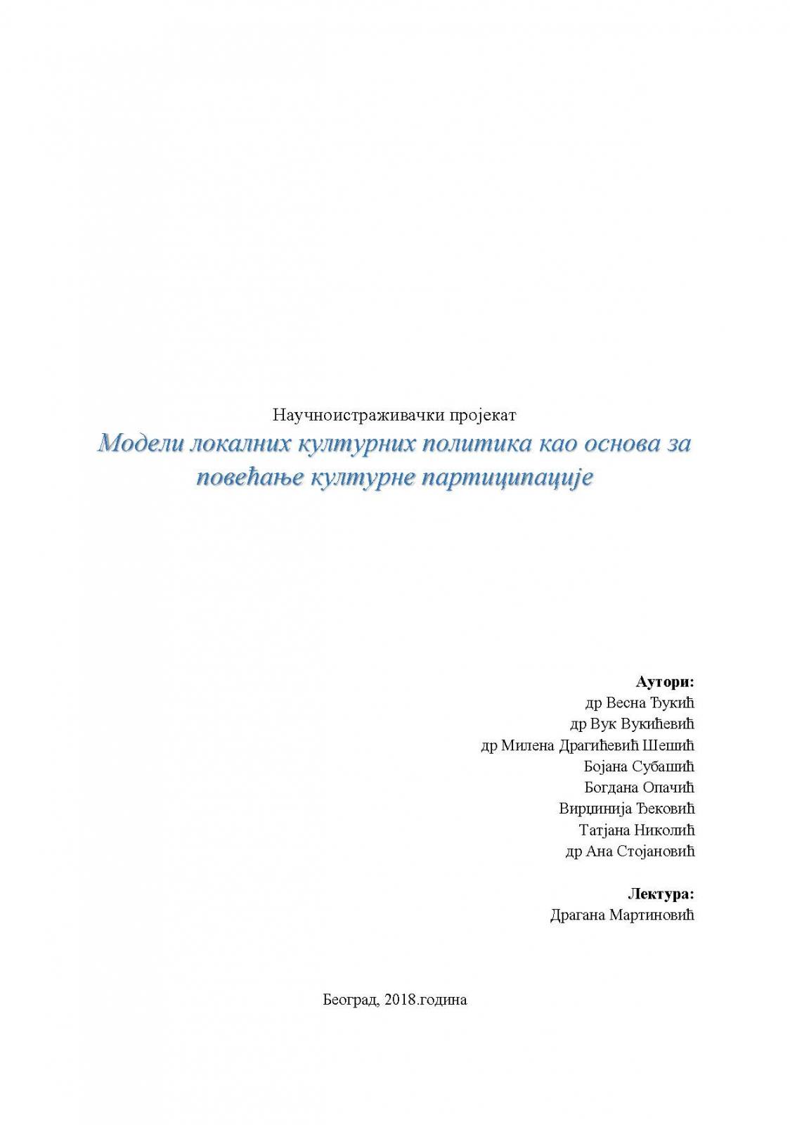 Studija „Modeli lokalnih kulturnih politika kao osnova za povećanje kulturne participacije“ nastala je kao rezultat empirijskog istraživanja u 15 lokalnih samouprava sa najvećim brojem stanovnika neračunajući Beograd, odnosno najrazvijenijom kulturnom infrastrukturom, pritom poštujući regionalnu zastupljenost gradova u uzorku (Kragujevac, Kruševac, Užice, Kraljevo, Čačak, Novi Sad, Subotica, Zrenjanin, Pančevo, Sombor, Leskovac, Vranje, Smederevo, Niš i Zaječar).