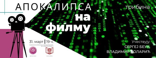 APOKALIPSA NA FILMU je prva tribina ciklusa HRIŠĆANSTVO I FILM, u organizaciji Zavoda za proučavanje kulturnog razvitka i Univerzitetske biblioteke „Svetozar Marković“ u Beogradu. Tribina će biti održana 31. marta u 19 časova u Univerzitetskoj biblioteci u Beogradu.