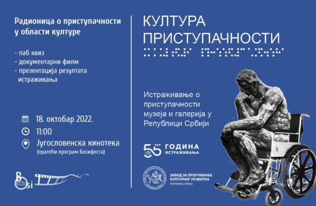 Radionica podrazumeva održavanje pab kviza na temu pristupačnosti ustanova kulture, prikazivanje kratkog dokumentarnog filma i prezentaciju nedavno objavljenog istraživanja ,,Kultura pristupačnosti: istraživanje pristupačnosti muzeja i galerija u Republici Srbiji“. Satnicu sa temama radionice možete naći u prilogu.